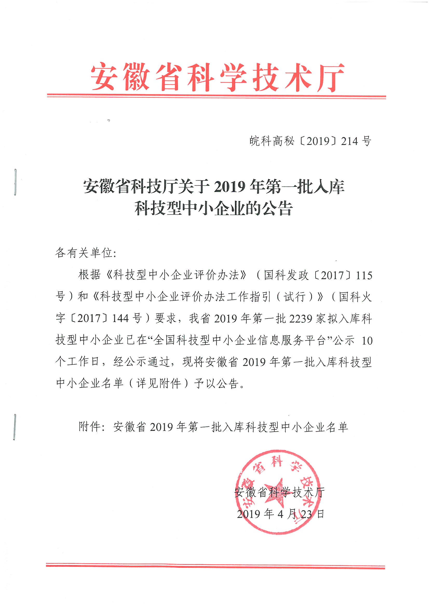 安徽省2019年第一批入庫科技型中小企業名單公告