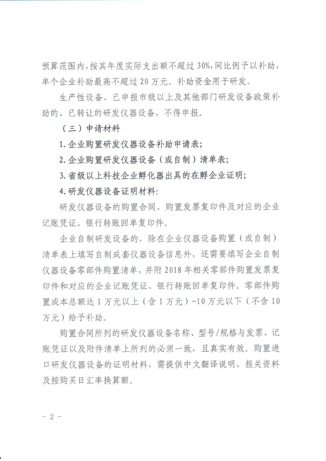 對2018年購置或自制用于研發的關鍵儀器設備原值:1萬元以上(含1萬元)-10萬元以下(不含10萬元),按其年度實際支出額不超過30%予以補助,單個企業補助最高不超過20萬元。補助資金用于研發。