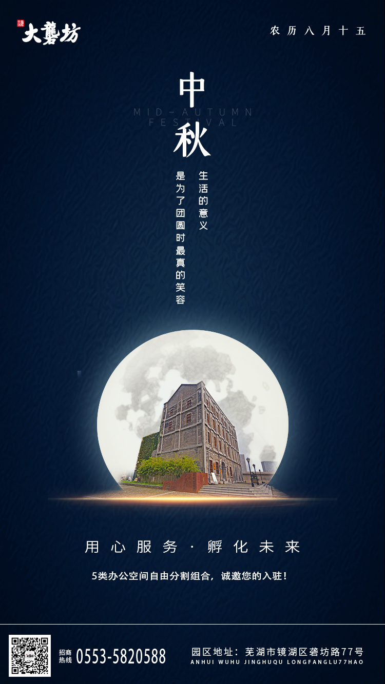 又是一年中秋時,又是一年團圓日。想必又是一次美好的“小長假”。在此,大礱坊科技文化園向各位企業及所有工作人員送上真誠的節日祝福,祝大家闔家團圓,幸福安康。